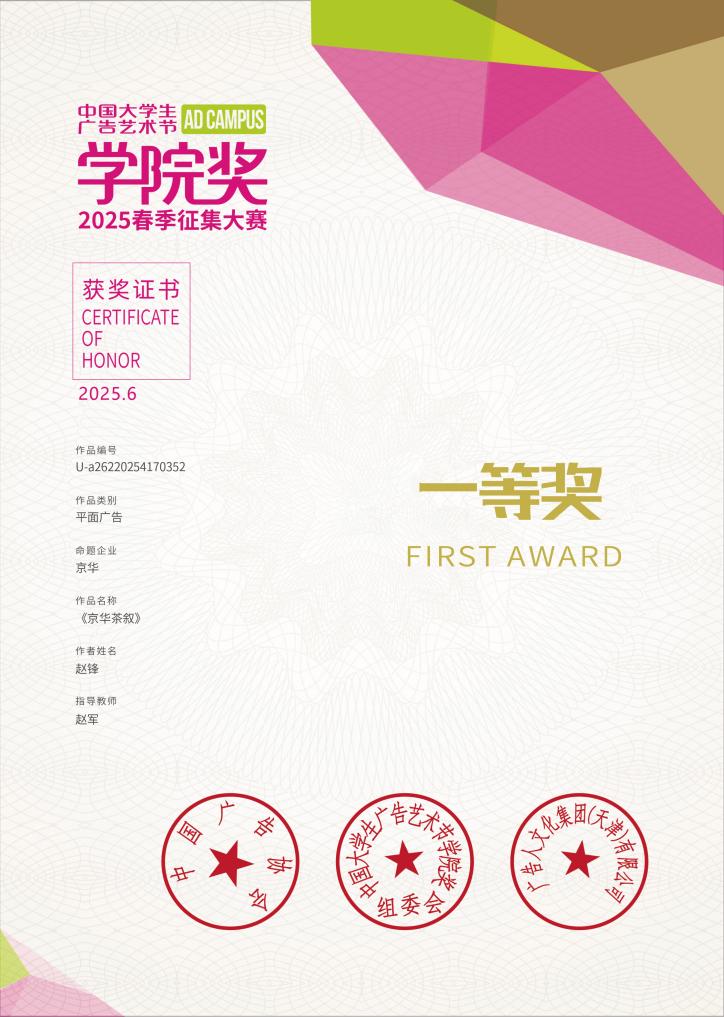 数媒233班赵锋的《京华叙事》以AI生成的水墨风格视觉元素,再现传统茶文化意境,荣获京华命题区域赛一等奖;