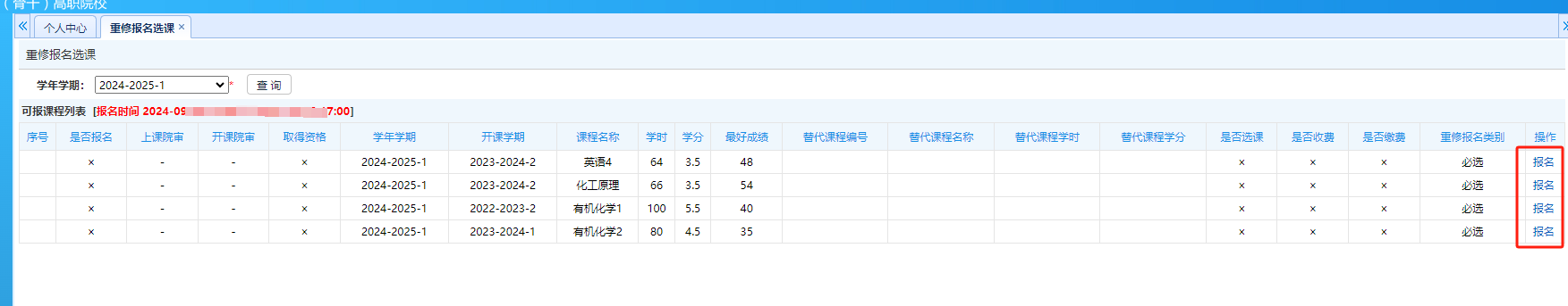 1.重修可报课程为除公共选修课、军训课程外,所有仍未及格课程;